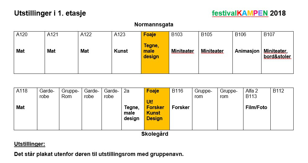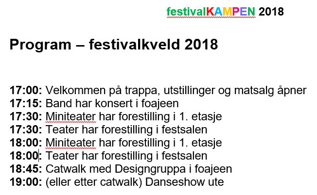 Nok en gang er vi klare for festivalKAMPEN, sommerens vakreste eventyr der vi retter fokus på de estetiske fagene. Klasser og timeplaner løses opp, og elevene arbeider med et felles tema under festivaldagene. Festivalen avsluttes med dans-, musikk- og teaterforestillinger både inne på skolen og ute i skolegården. Flotte kunstverk stilles ut i klasserom, korridorer og foaje. Mat og drikke i regi av FAU vil bli å få kjøpt i skolegården.