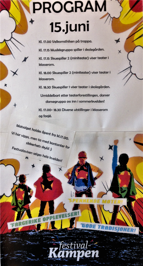 Festivalen starter fredag 9.juni og avsluttes torsdag 15.juni med arrangement i skolebygget og i skolegården fra kl.17.00. Vi gleder oss!